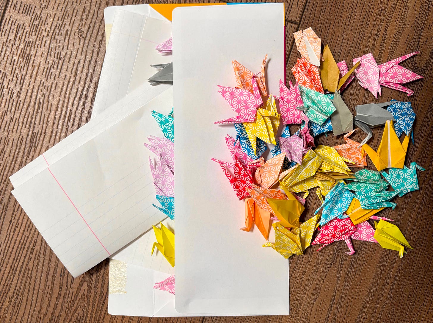 We have managed to fit 50 small cranes, plus two letters, into a business-sized envelope. Flattening with a book or heavy object for several days will help you meet the thickness requirement. A stack of small penpal letters can travel in an envelope, as long as its depth does not exceed .25” in the USA (and similar in most of the world). Unfolded, this will probably be up to 50 letters, depending on the thickness of your paper.